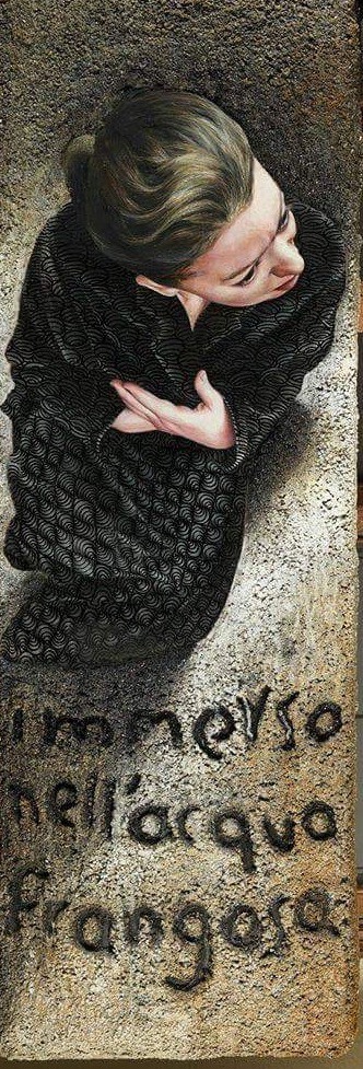 The painter tells a prayer that grows in space as a visual installation. Mixed techniques create rough textures and relief surfaces that host words, faces, symbols, stimulating the feeling of the viewer who travels with them to the Mediterranean Sea.
