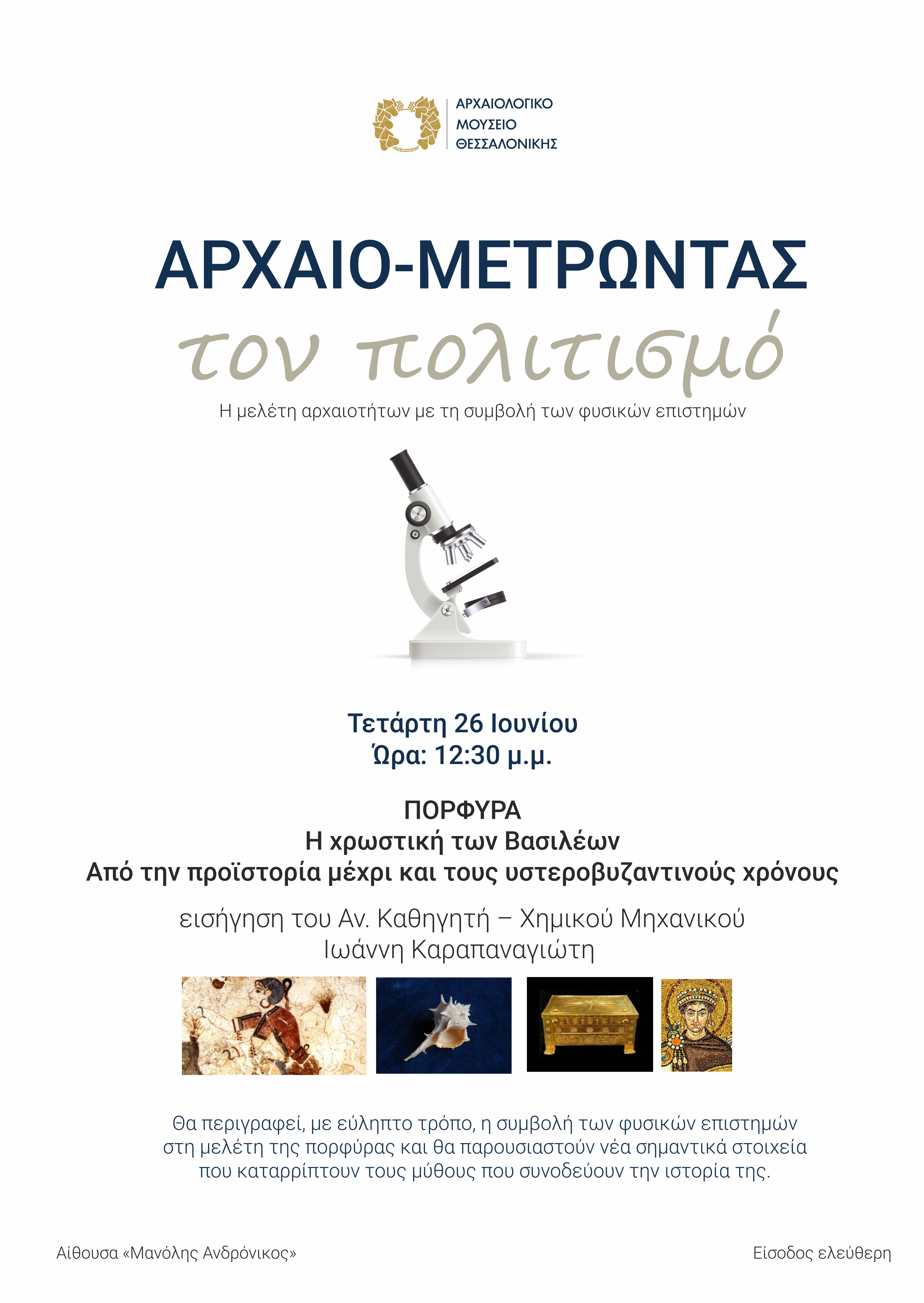 Ο ομιλητής θα περιγράψει τη συμβολή των φυσικών επιστημών στη μελέτη της πορφύρας και θα παρουσιάσει τα αποτελέσματα των ερευνών της τελευταίας δεκαετίας, προσφέροντας νέα σημαντικά στοιχεία που καταρρίπτουν τους μύθους που συνοδεύουν την ιστορία της.