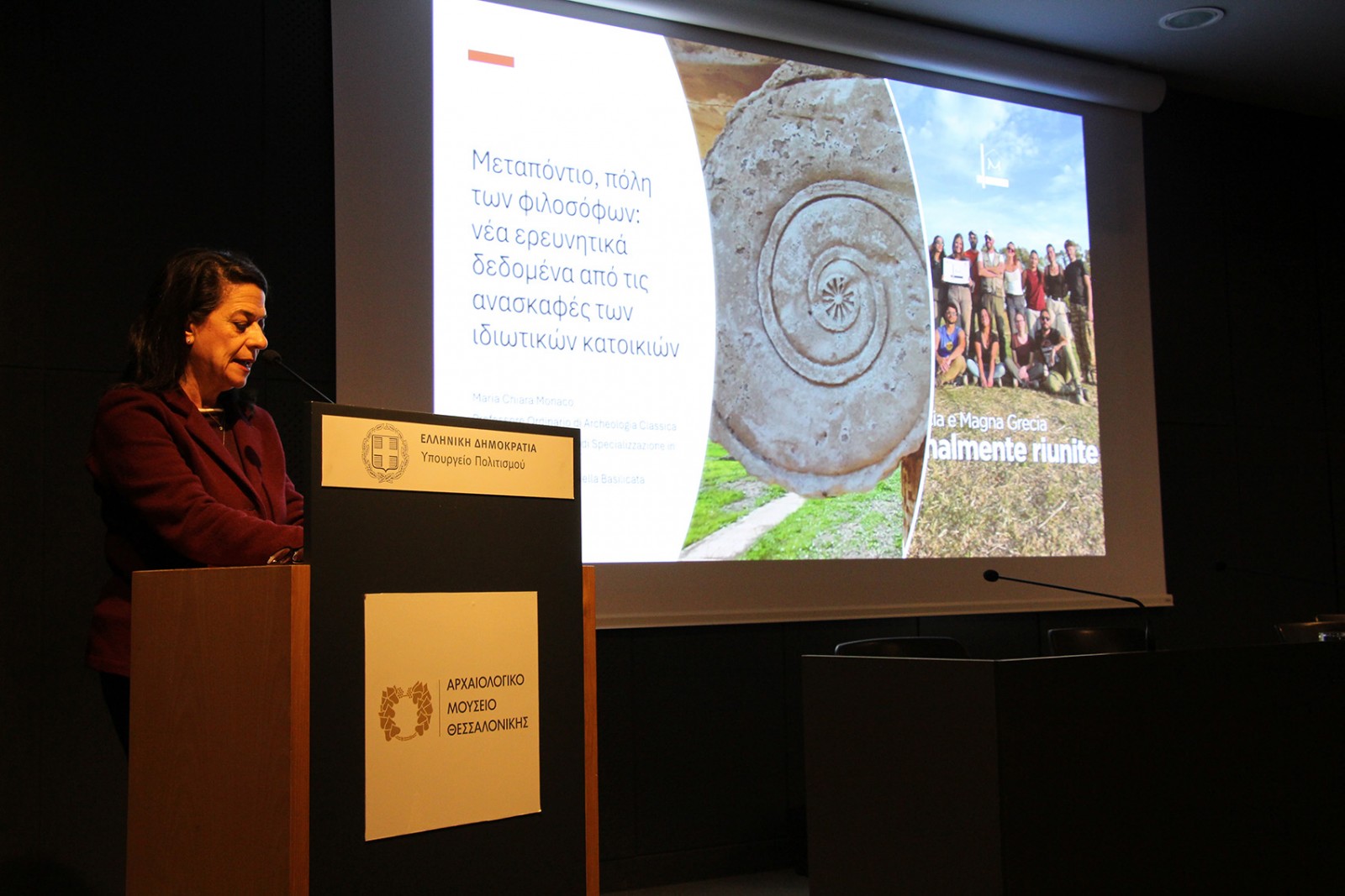 Η Maria Chiara Monaco, Καθηγήτρια κλασικής αρχαιολογίας και Διευθύντρια της Σχολής Ειδίκευσης στην Αρχαιολογία UNIBAS/Matera έρχεται στο Αρχαιολογικό Μουσείο Θεσσαλονίκης με μια αρχαιολογική διάλεξη με τίτλο: «Μεταπόντιο, πόλη των φιλοσόφων: νέα ερευνητικά δεδομένα από τις ανασκαφές των ιδιωτικών κατοικιών».