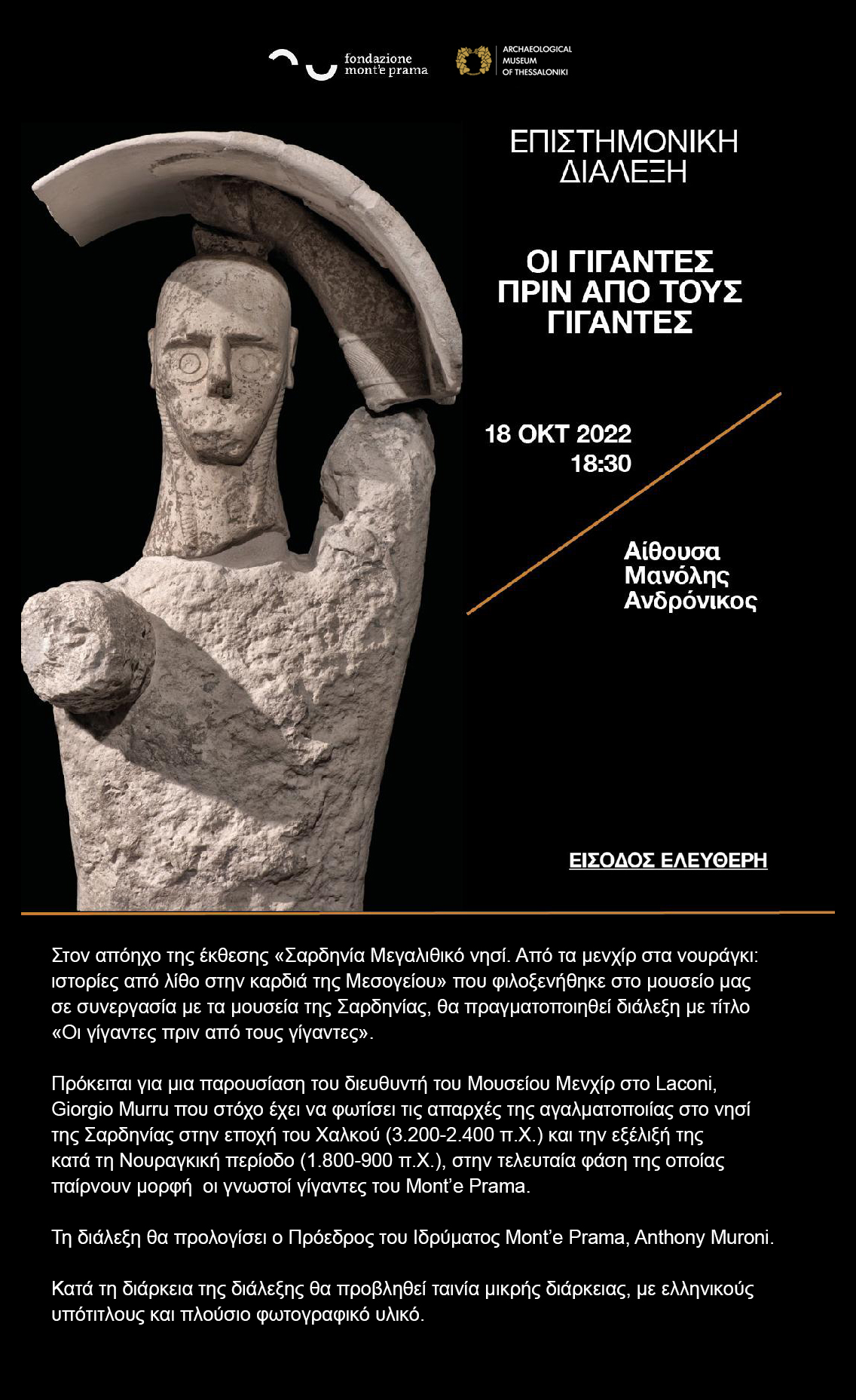 Στον απόηχο της έκθεσης «Σαρδηνία Μεγαλιθικό νησί. Από τα μενχίρ στα νουράγκι: ιστορίες από λίθο στην καρδιά της Μεσογείου» που φιλοξενήθηκε στο μουσείο μας σε συνεργασία με τα μουσεία της Σαρδηνίας, θα πραγματοποιηθεί διάλεξη με τίτλο «Οι γίγαντες πριν από τους γίγαντες».