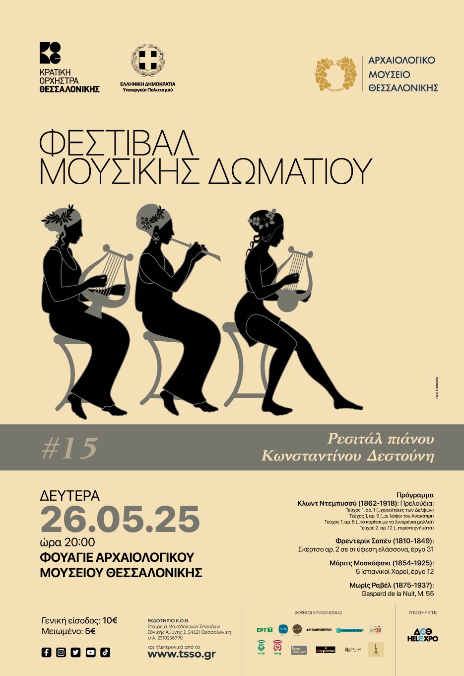Στο πλαίσιο του Φεστιβάλ Μουσικής Δωματίου της ΚΟΘ στο Αρχαιολογικό Μουσείο Θεσσαλονίκης παρουσιάζεται ένα μοναδικό Ρεσιτάλ Πιάνου από τονΚωνσταντίνο Δεστούνη, σε συνθέσεις των Ντεμπυσσύ, Σοπέν, Μοσκόφσκι και Ραβέλ.