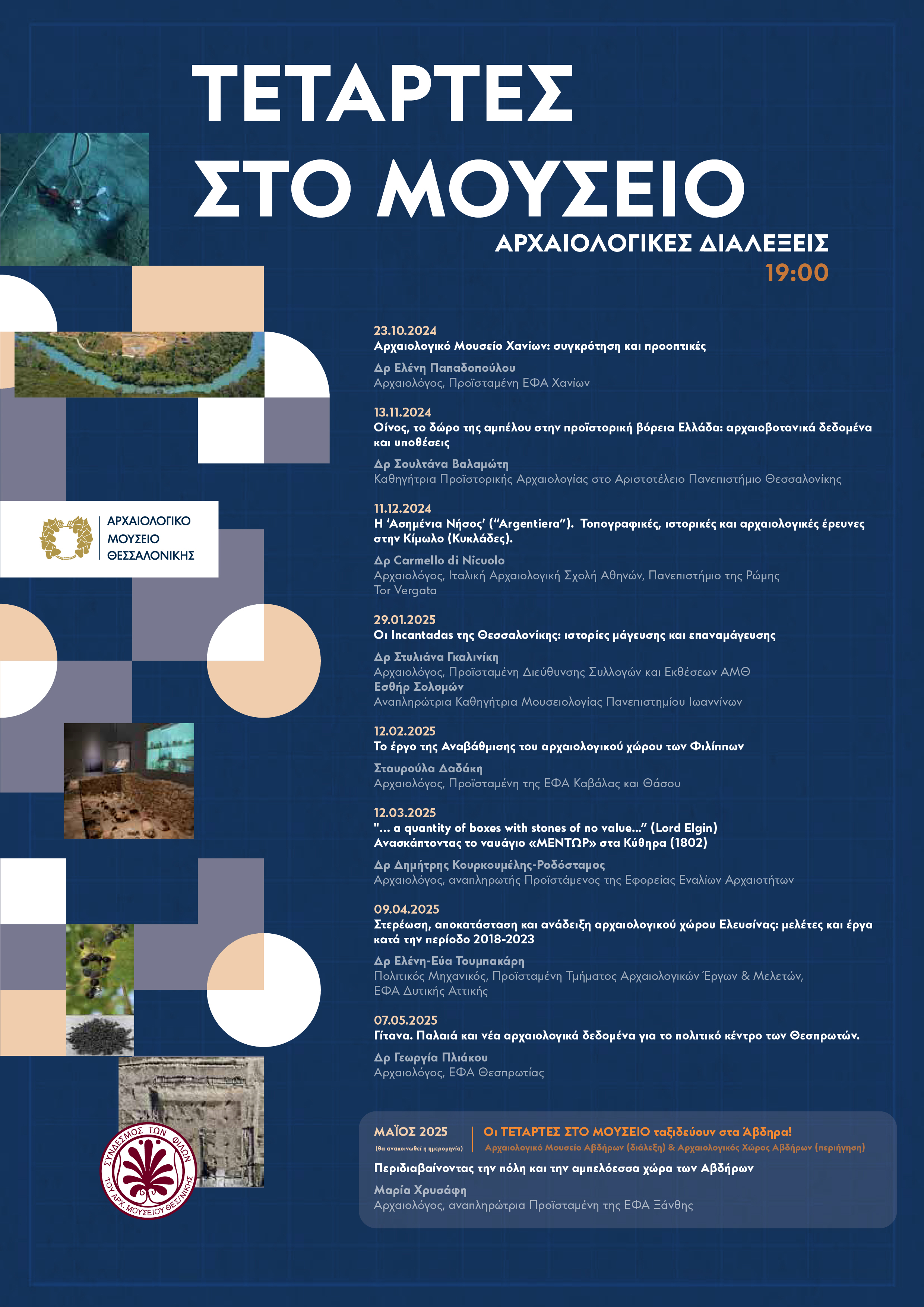 Το Αρχαιολογικό Μουσείο Θεσσαλονίκης σε συνεργασία με τον Σύνδεσμο Φίλων ΑΜΘ υποδέχεται τη Σταυρούλα Δαδάκη, αρχαιολόγο, Προϊσταμένη ΕΦΑ Καβάλας και Θάσου, με τη διάλεξη «Το έργο της Αναβάθμισης του αρχαιολογικού χώρου των Φιλίππων». Στην ομιλία θα παρουσιαστούν τα αποτελέσματα του έργου που πραγματοποιήθηκε για την αναβάθμιση του αρχαιολογικού χώρου μιας πολλά υποσχόμενης πόλης της ύστερης αρχαιότητας.
