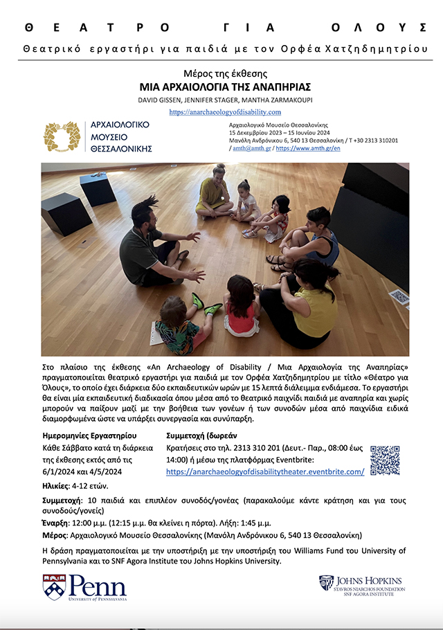 Αποτελεί την εκπαιδευτική δράση της περιοδικής έκθεσης «Μια Αρχαιολογία της Αναπηρίας» και απευθύνεται σε παιδιά ηλικίας 4-12 ετών. Το εργαστήρι θα είναι μία εκπαιδευτική διαδικασία όπου μέσα από το θεατρικό παιχνίδι παιδιά με αναπηρία και χωρίς μπορούν να παίξουν μαζί με την βοήθεια των γονέων ή των συνοδών μέσα από παιχνίδια ειδικά διαμορφωμένα ώστε να υπάρξει συνεργασία και συνύπαρξη.